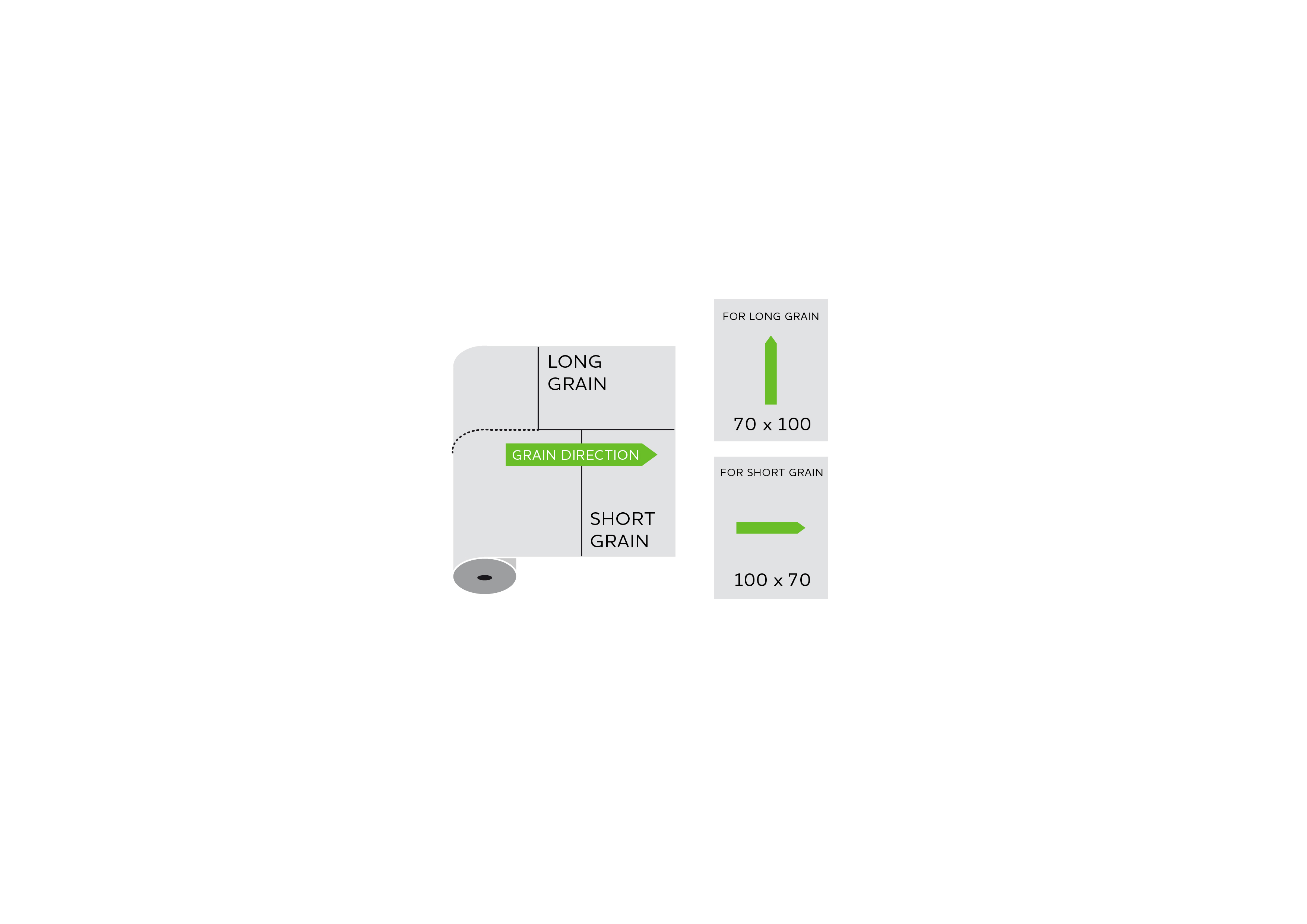 We write the formats in the international style. A higher number at the beginning indicates short grain and the lower number at the beginning indicates long grain. Example: 102 x 72cm = short grain; 72 x 102cm = long grain.